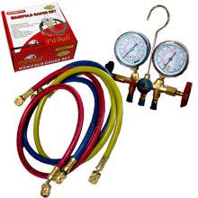3 Color-Coded Hoses Complete Diagnostic and Service Gauge Set for use on Air Condition Systems Quick-Connect Fittings with High Pressure Safety Valve Color-Coded Gauges, Valves and Hoses Easy to Read Gauges