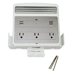 Attaches directly to wall outlet 2 cushioned, non-skid shelves Slide-out, adjustable side pockets for additional storage Optional hang hooks for cords or keys Surge protection